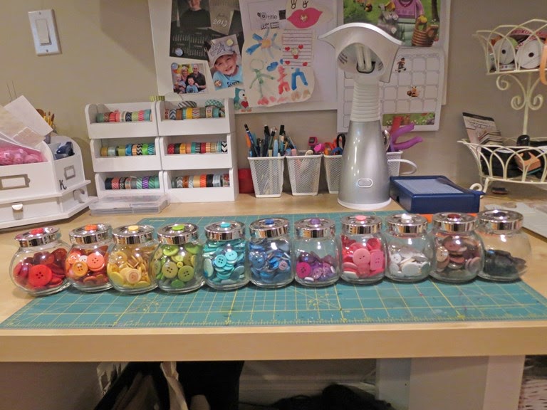 Next to this desk is my rolling cart, which holds my paints, inks, sprays, glitter, buttons, and miscellaneous embellishments. The jars that hold my button collection are from Ikea (as is most of the furniture in the room). I glued a button to the lid of each jar so that when they are in the rolling cart, I can easily see which color buttons each jar contains.