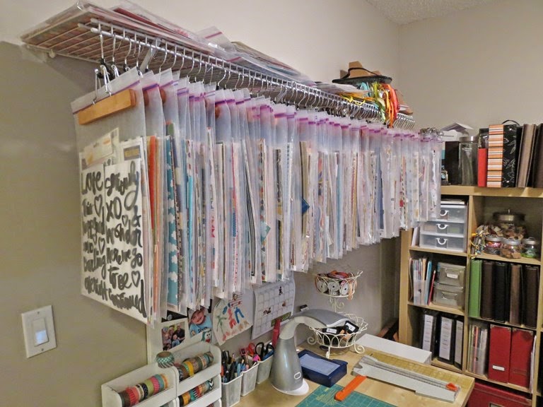 Above my desk, I attached a wire shelf to the wall and I hang my paper collections in Zip-loc bags. Each bag contains all the paper and embellishments for each of my newer collections. I find it so handy to have everything I need in that bag to complete a layout and I can flip through them quickly when I’m looking for the perfect collection to go with my photos.