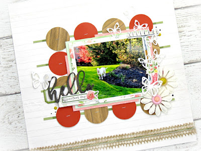 I start by gathering some of my supplies to create my base for my layout. Next, using a 1 3/4 circle paper punch I created several circles, I then cut out a few thin strips of pattern paper which I use to attach my circles to.