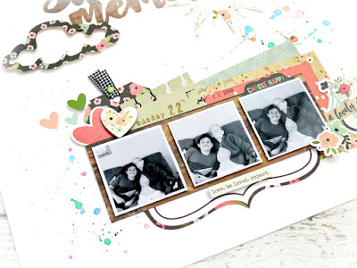 To the right of the photos I added another small cluster of cardstock stickers. I added some foam tape underneath a few of stickers to lift them and give them some extra dimension. I also added the 'Love.be Love.repeat' cardstock sticker directly below the bottom of my photo strip.