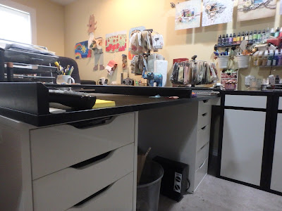 Here's the view toward my desk from his. As you can see, I pack a lot into the space I have. Organization is the key - everything has a place, most of it within easy reach (I'm lazy that way!). For the most part I manage to keep to my side, though you may notice that my two-tier Clip-It Up has intruded onto the corner of his desk.