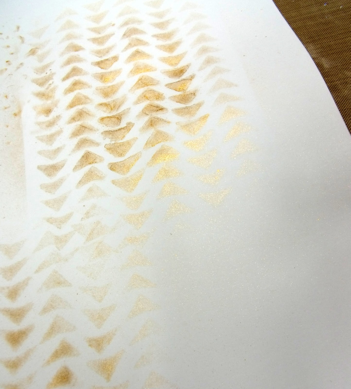 Next, I applied Versamark through my mask randomly on the page. For the type of embossing powder I was using, craft adhesive was recommended but I opted for Versamark instead.
