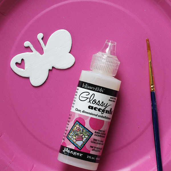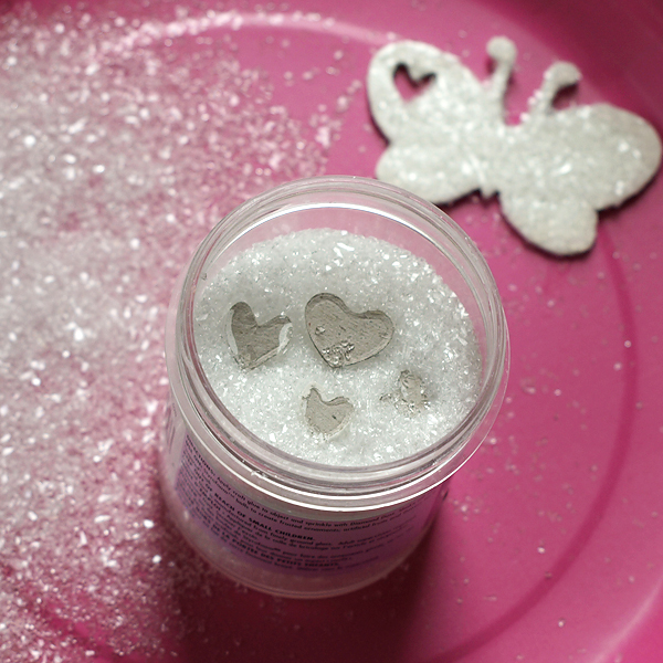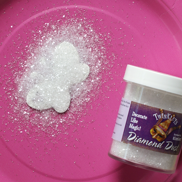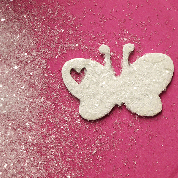 Immediately sprinkle a generous amount of diamond dust on top of the glossy-accented chipboard shape.