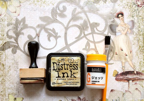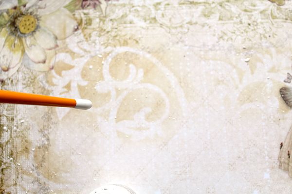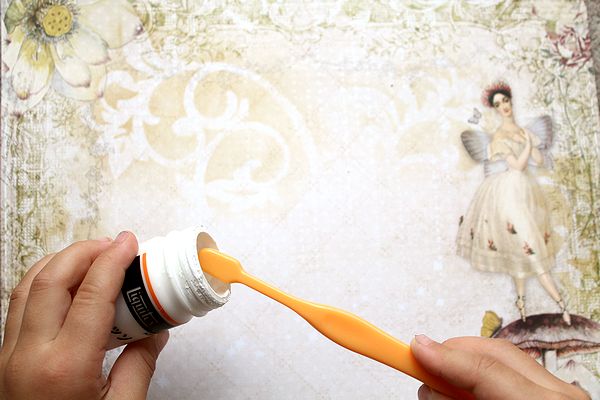 I catch a toothbrush on the rim of the bottle of Gesso and scatter.