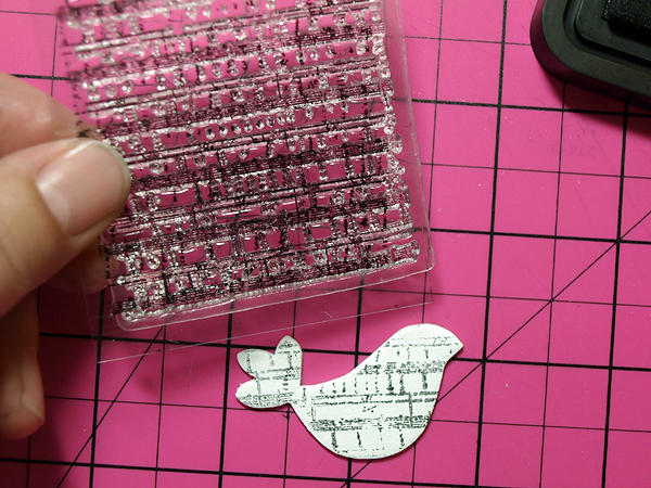 Since I wanted to achieve an uneven and sort of random-looking stamped image, I left the stamp on the plastic sheet that it came on and used it that way rather than using it on an acrylic block.
