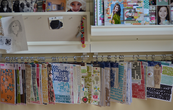 Attached to the very bottom of the display boards (thanks to my hubby), there are curtain rods for my current "go to" alpha stickers and packaged embellishments. Items are easily removed and brought over to my work space because they are clipped onto hooks that hang over the rings on the rod.