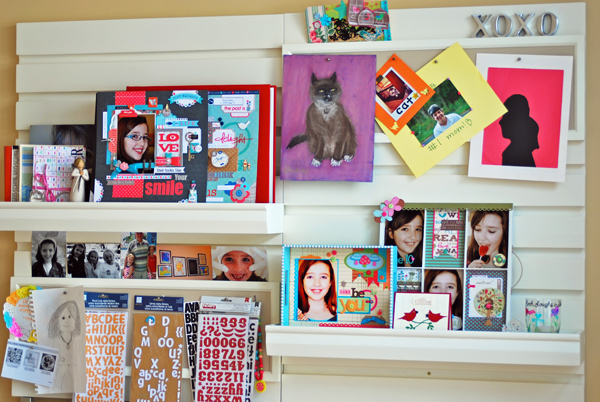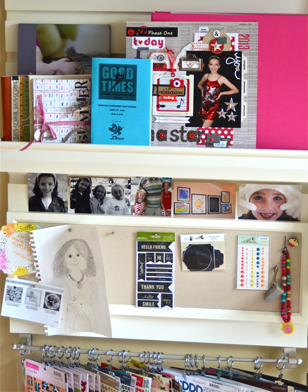 The top left shelf has mini albums and current layouts on display. Just below that are some photos tucked behind a pin board. The pin board itself holds drawings and crafts my daughter has made, along with packages of newer product.