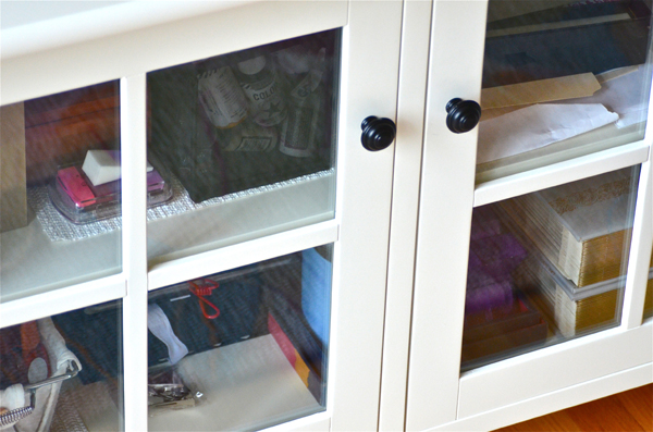 Below the shelf display is a storage cabinet that holds my ribbon stash, sewing materials, inks, extra adhesives, etc. A storage caddy on top holds product for current design team and freelance work as well as new supplies that I'm not done playing with yet.
