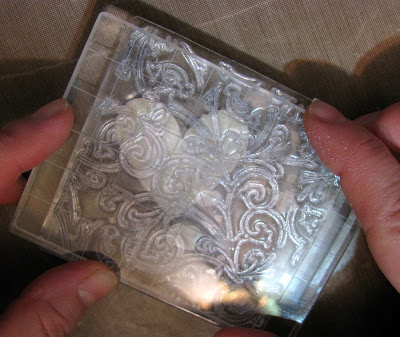 Heat embossing powder. I repeated the embossing ink and UTEE process 3 times. ( By adding three layers, it created a thick coat in which I could create a good impression with a stamp.) After heating the last layer of embossing powder immediately press your stamp into the UTEE while it is still warm. I did not to add ink to my stamp as it was the flourish impression I was after.