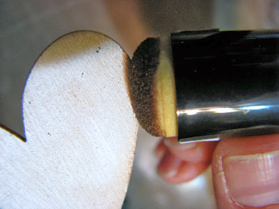 I applied embossing ink directly to the wood on the edges and in random area. While still wet, I added Ranger Distress Embossing Powder. Heat.