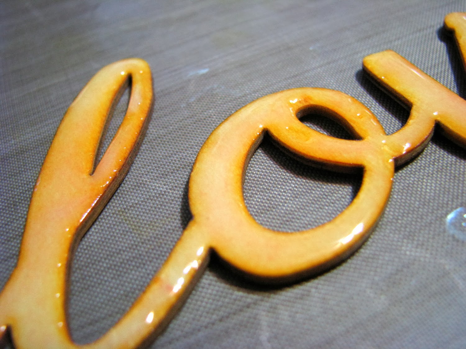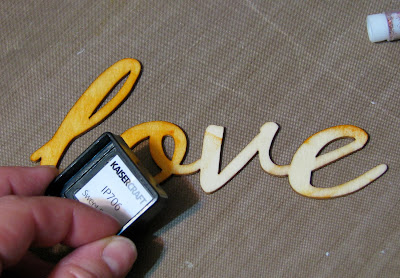 The first one I chose is the word "love." I started by applying ink directly to the wood. Although I will be adding glitter, I don't want white showing through.