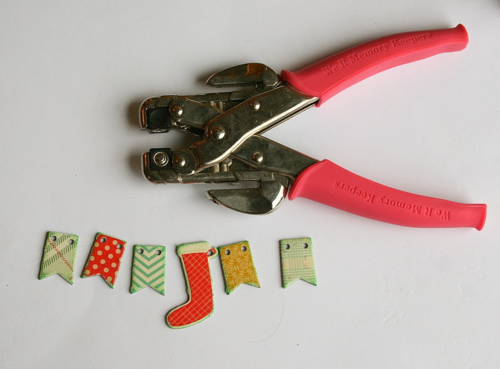 Next I distressed and inked the chipboard pieces. Using my CropODile, I added two holes at the top of each banner piece.